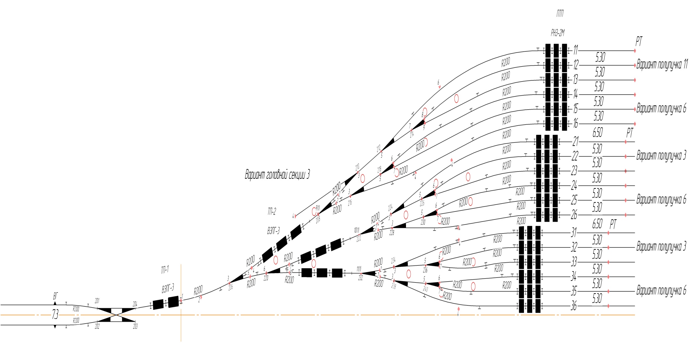 При 18 путях в верхней половине сортировочного парка было запроектировано 3 пучка (в каждом по 6 путей). Таким образом, была принята для головной секции схема №3.