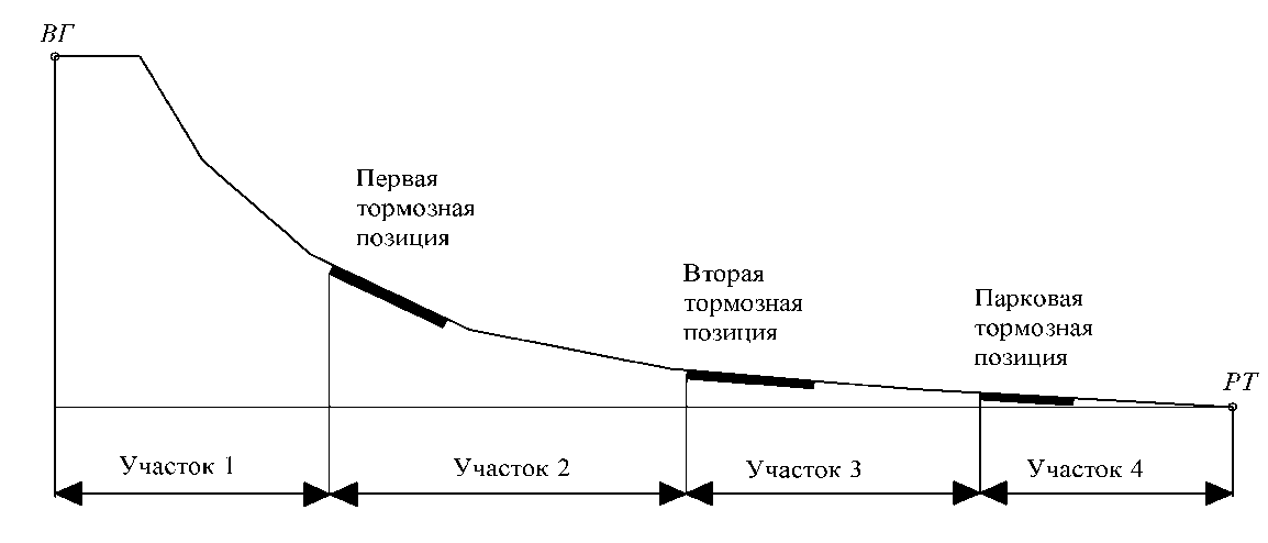 Продольный профиль спускной части горки состоит из отрезков пути с постоянным уклоном и кривых, сопрягающих эти отрезки в вертикальной плоскости. В качестве границ элементов продольного профиля условно были приняты вершины вертикальных углов. В связи с этим длина элемента определена как расстояние между смежными вершинами вертикальных кривых, измеренное по продольной оси расчетного пути.
