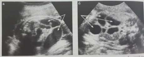 УЗД плода – атрезия тонкого и толстого кишечника - на 20-24-29 нед. – делятация (расширение) петель кишечника на разных уровнях (множество расширенных петель кишечника) с усиленной перистальтикой и плавающими частицами мекония, количество петель отражает уровень непроходимости.