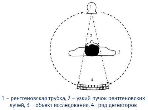 • В СКТ рентгеновская трубка с детекторами постоянно вращается вокруг непрерывно движущегося стола с пациентом. Это позволило не только сократить время исследования, но и устранить ограничения «пошаговой» методики – пропуска участков, которые «не попали в срез», а также участков, которые пропускались из-за разной глубины задержки дыхания пациентом.