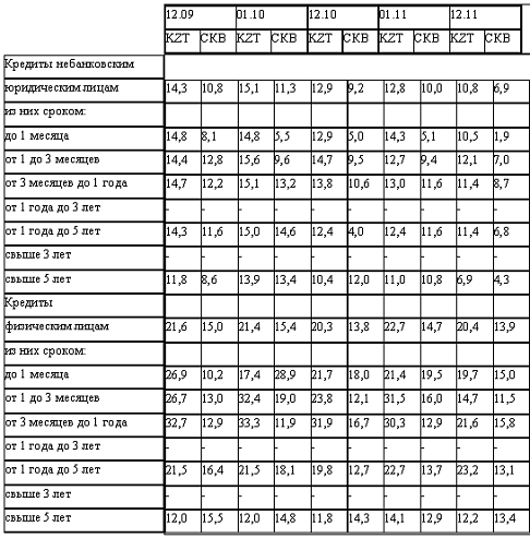 В отраслевой разбивке наиболее значительная сумма кредитов банков экономике приходится на торговлю - 24,0% (в декабре 2009 года - 23,6%), строительство - 18,1% (18,8%), промышленность - 9,4% (9,5%), сельское хозяйство - 3,8% (3,7%). Средневзвешенная ставка вознаграждения по кредитам физическим лицам в национальной валюте в декабре 2010 года по сравнению с декабрем 2009 года понизилась с 21,6% до 20,3%, по кредитам юридическим лицам снизилась с 14,3% до 12,9% (рисунок 3)