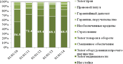 Поскольку ЗАО «РРБ-Банк» специализируется на потребительском кредитовании физических лиц, в его портфеле доминируют необеспеченные кредиты. Так, порядка 70 % кредитного портфеля банка формально обеспечено неустойкой (см. рисунок 2.4), однако, руководствуясь экономическим содержанием данной правовой категории, неустойку можно скорее отнести к штрафным санкциям, а не способу обеспечения обязательств по кредитному договору. Значительная доля необеспеченных кредитов в портфеле хотя и характерна для розничных банков, но повышает рискованность кредитных вложений ЗАО «РРБ-Банк».
