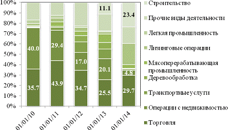 Качество корпоративного кредитного портфеля ЗАО «РРБ-Банк» с точки зрения диверсификации по отраслевой принадлежности кредитополучателей в 2010 - 2013 гг. улучшилось (рисунок 2.6). Так, доля задолженности предприятий торговли снизилась с 43,9 % на 01.01.2011 до 29,7 % на 01.01.2014. Кроме того, банк сократил кредитование высокорисковой сферы операций с недвижимостью и более активно начал кредитовать строительные организации (23,4 % корпоративного портфеля на 01.01.2014), а также лизинговые компании (20,7 %).