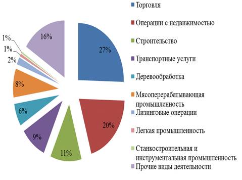 Наибольший удельный вес по состоянию на 01.01.2014 г. занимала кредитная задолженность юридических лиц и индивидуальных предпринимателей в сфере торговли. За анализируемый период ее доля увеличилась на 9,2 п.п. На втором месте лизинговые операции - 22,4%. За анализируемый период доля снизилась на 6,5 %. Наименьший удельный вес приходится на станкостроительную и инструментальную промышленность. В течение 2013-2014 гг. он составлял 0,1-0,5%. За анализируемый период увеличилась доля кредитов мясоперерабатывающей промышленности, а также операции с недвижимостью.