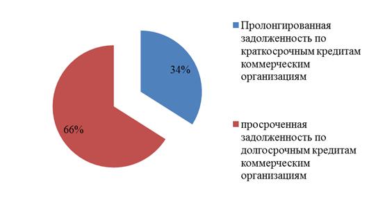 Как видно, за анализируемый период доля проблемной задолженности снизилась. На 01.01.2014 г. на пролонгированную задолженность приходилось 34 %, общей задолженности. В 2014 году просроченная задолженность по краткосрочным кредитам коммерческим организациям отсутствовала. Доля просроченной задолженности коммерческих организаций в 2014 году составила 66 %. Просроченная задолженность по долгосрочным кредитам коммерческим организациям увеличилась за анализируемый период на 5,8 п.п.