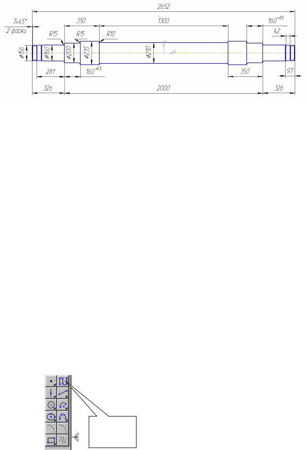 з'явився, у центр координат та натисніть ліву кнопку миші. Потім вкажіть другу точку контакту у правому кінці контуру осі колісної пари. Отримавши вигляд половини осі (рис.4), повторюємо дану операцію і маємо повне креслення.