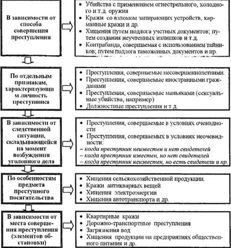 Как основной признак используется, прежде всего, видовая уголовно-правовая классификация преступлений (например, убийство, разбойное нападение, кража и т.п.) с учетом элементов состава преступления.