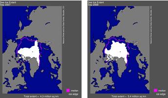 Площади ледяного покрова в сентябре 2007 и 2009 годов. (nsidc.org)