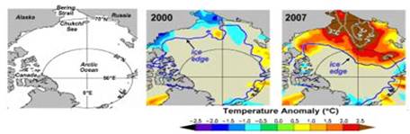 Потепление особенно заметно с 1995, а ещё больше с 2000. Точка, где температура была на пять градусов выше среднего, находится севернее Чукотского моря. Историческое среднее тут -1°С . В 2007 году вода в этом районе потеплела до +4°С.