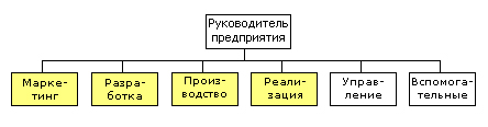 Один из вариантов целей верхнего уровня (топ-менеджеров) - это, например, выявление требование рынка, разработка новой конкурентоспособной продукции, ее производства с малыми издержками, реализации продукции, и соответственно создается линейная организационная структура с формированием структурных подразделений по функциональному признаку (рис. 1).