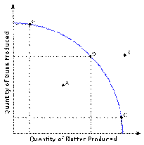 В данном случае точки А, Б, В, Г, Д - точки, принадлежащие КПВ. Точка E внутри графика КПВ означает неполное или нерациональное использование имеющихся ресурсов. Точка Ж (выше кривой) недостижима при данном количестве ресурсов и имеющейся технологии. Попасть в эту точку можно, если увеличить количество используемых ресурсов или улучшить технологию производства (например, сменить ручной труд на машинный). При движении по кривой возможен только один, лучший вариант движения, который дает максимальный результат при минимальных затратах. Кривая производственных возможностей показывает совокупность всех точек или решений, в пределах которых следует выбирать оптимальный вариант. Все остальные точки представляют собой упущенные возможности или альтернативные затраты <https://ru.wikipedia.org/wiki/%D0%90%D0%BB%D1%8C%D1%82%D0%B5%D1%80%D0%BD%D0%B0%D1%82%D0%B8%D0%B2%D0%BD%D1%8B%D0%B5_%D0%B7%D0%B0%D1%82%D1%80%D0%B0%D1%82%D1%8B>.