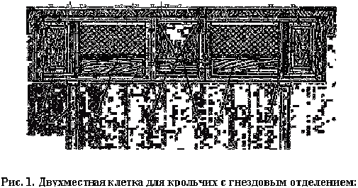 Двухместные одноярусные клетки для содержания основного стада имеют длину 1200 мм и ширину 550 мм. Клетка состоит из постоянного гнездового (маточного) отделения со сплошным деревянным полом и кормового отделения с реечным или сетчатым полом (размер ячеек сетки 16 х 48 мм). Гнездовое отделение размещают вдоль наружных боковых стенок, а оставшуюся часть клетки используют как кормовое отделение. В перегородке между гнездовым и кормовым отделениями на уровне 100- 120 мм от пола делают лаз шириной 170 мм и высотой 170- 200 мм. С фасадной стороны клетки навешивают четыре дверки: две сетчатые, открывающиеся в кормовые отделения, и две сплошные деревянные, ведущие в гнездовые отделения. Для грубых кормов между кормовыми отделениями устанавливают V-образные ясли.
