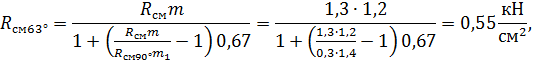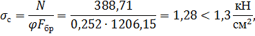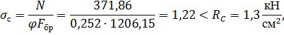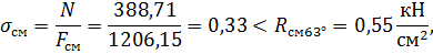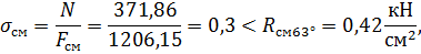 Соединение подкоса с ригелем выполняем лобовым упором ввиду того, что в подкосе рамы возникают только сжимающие силы. Для обеспечения боковой жесткости узла, а также для восприятия растягивающих усилий в подкосе при монтаже рамы по обе стороны подкоса и ригеля ставим накладки сечением190х66 мм, которые прикрепляются к подкосу и ригелю четырьмя болтами dб=20 мм. Проверяем на смятие ригель в месте примыкания подкоса: