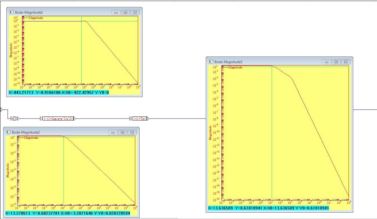 Объект моделируется двумя звеньями: колебательным (с большим подавлением) и апериодическим. Сопрягающая частота апериодического звена на две декады больше резонансной частоты колебательного звена. |