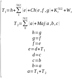 На наступному кроці відбувається нелінійні перетворення блоків. Основою алгоритму являється модуль, що складається з 80 циклічних обробок кожного блоку. Такий модуль циклічних обробок визначається наступними формулами (1.1.17):