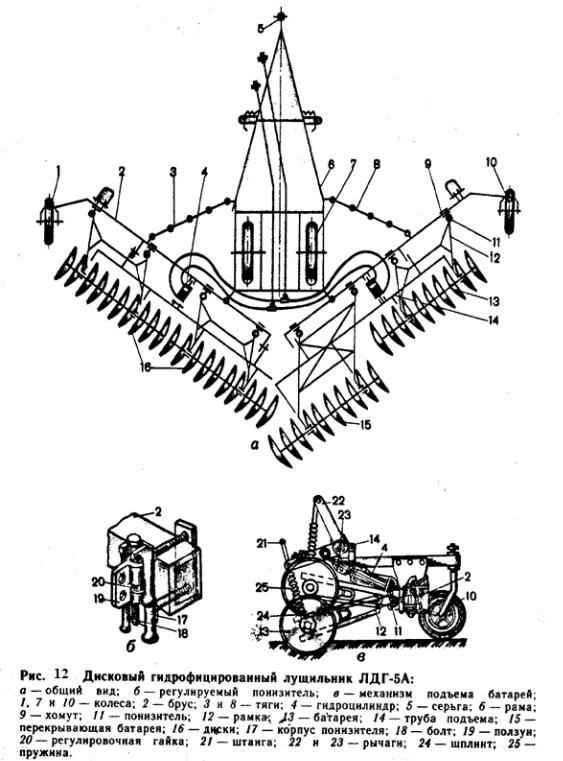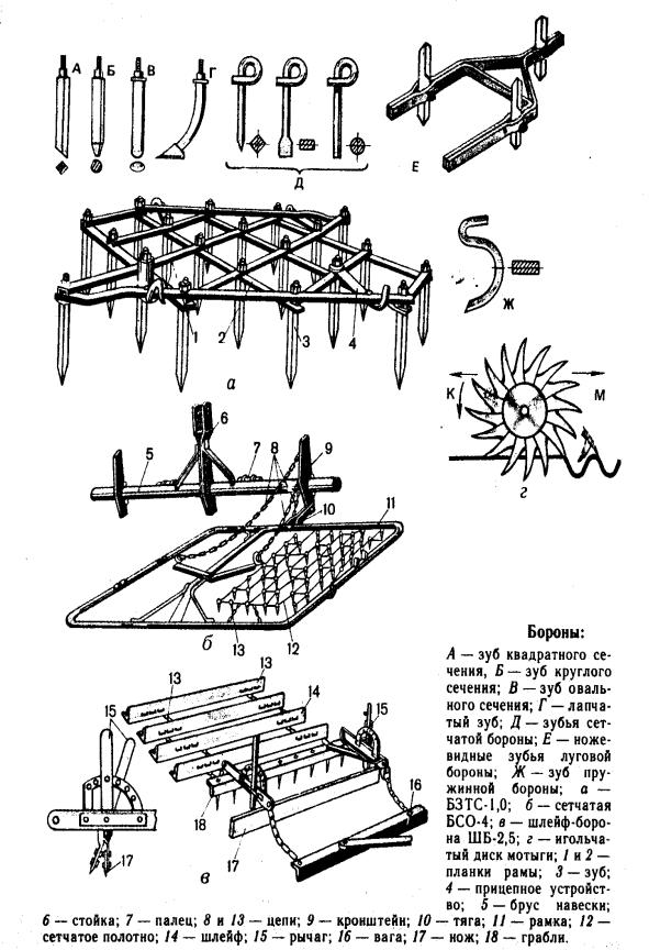а-общий вид; б-батарея; в-диск легкой бороны; г-диск тяжелой бороны; 1- навеска; 2-батарея; 3-рама; 4-боковой брус; 5-ось; 6-диск; 7-шпулька; 8- кронштейн; 9-штырь; 10-чистик; 11-подшипник