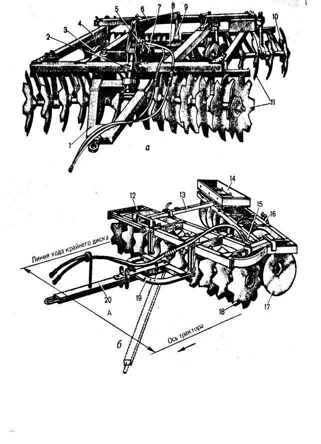 Рисунок 11 – Тяжелые дисковые бороны а-полевая БДТ-3; б-садовая БДСТ-2,5; 1-прицепное устройство;