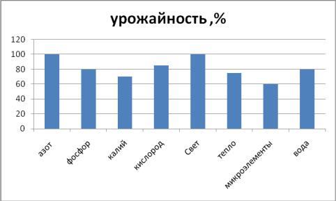 Наглядно этот закон изображается в виде бочки, клепки которой означают различные факторы жизни растений. Высота клёпки соответствует степени обеспеченности потребности растения в данном факторе, выраженной в процентах. Из приведённого примера видно (рис. 1), что два фактора азот и свет удовлетворяют потребности растений полностью, а остальные находятся в недостатке. Сдерживающим фактором является микроэлементы и урожай можно получить порядка 58 процентов от потенциальных возможностей сорта. Значит, внесение микроэлементов поднимает планку урожая в данном примере до 70 %, где сдерживающим фактором будет содержание калия