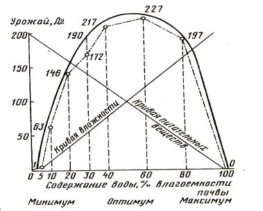 На основе подобных опытов Сакесом были сформулированы законы минимума, оптимума и максимума. Их смысл состоит в том, что наибольший урожай может быть получен при оптимальном количестве фактора; уменьшение или увеличение его ведет к снижению урожая. В этом можно убедиться на примере такого фактора как температура. Любой жизненный процесс в растении начинается при каком-то минимуме температуры, протекает наилучшим образом при оптимальной температуре, замедляется, а затем совсем прекращается по мере дальнейшего ее повышения.