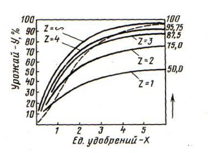 Каждая кривая на графике подчинена этой формуле. Серия кривых на графике показывает, что с увеличением другого фактора (Z) кривые идут выше. С изменением факторов меняется и величина А. При изменении второго фактора А вырастает до А1, а с повышением Z до 3- до А2. Из этого отчетливо видно, что урожай в данный момент зависит