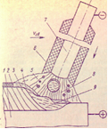 Ручную дуговую сварку выполняют сварочными электродами, которые вручную подают в дугу и перемещают вдоль заготовки. В процессе сварки металлическим покрытым электродом (рис. 5.7) дуга 8 горит между стержнем электрода 7 и основным металлом . Стержень электрода плавится, и расплавленный металл каплями стекает в металлическую ванну 9. Вместе со стержнем плавится покрытие электрода 6, образуя газовую защитную атмосферу 5 вокруг дуги и жидкую шлаковую ванну 4 на поверхности расплавленного металла. Металлическая и шлаковая ванны вместе образуют сварочную ванну. По мере движения дуги сварочная ванна затвердевает и формируется сварной шов 3. Жидкий шлак после остывания образует твердую шлаковую корку 2.