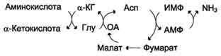 В мышечной ткани активность глутаматдегидрогеназы низка, поэтому в этих клетках при интенсивной физической нагрузке функционирует ещё один путь непрямого дезаминирования с участием цикла ИМФ-АМФ. Вначале происходит перенос аминогруппы аминокислот на аспартат, затем на инозиновую кислоту (ИМФ) и в завершение - дезаминирование АМФ. Представленная схема отражает последовательность реакций непрямого неокислительного дезаминирования: