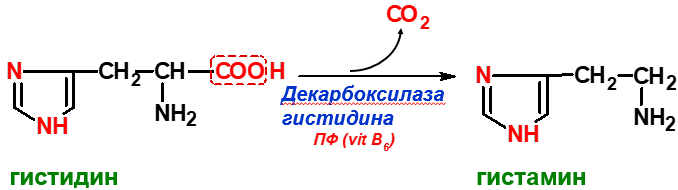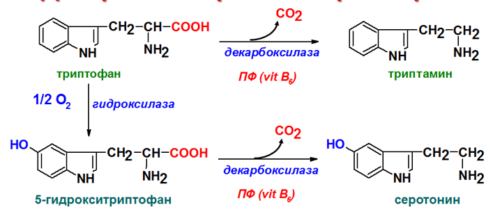 Декарбоксилирование – процесс отщепления группы СО2 при участии декарбоксилаз, небелковый компонент которых пиридоксальфосфат (ПФ), активная форма витамина В6. Реакции декарбоксилирования необратимы. Их продуктами являются СО2 и биогенные амины, которые выполняют функцию нейромедиаторов (серотонин, дофамин, ГАМК), гормонов (адреналин, норадреналин), регуляторных факторов местного действия (гистамин, карнозин и др.).