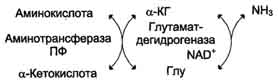 Наиболее активно в тканях происходит дезаминирование глутаминовой кислоты. Реакцию катализирует фермент глутаматдегидрогеназа, коферментом глутаматдегидрогеназы является NAD+. Реакция идёт в 2 этапа. Вначале происходит ферментативное дегидрирование глутамата и образование а-иминоглутарата, затем - неферментативное гидролитическое отщепление иминогруппы в виде аммиака, в результате чего образуется а-кетоглутарат. Окислительное дезаминирование глутамата - обратимая реакция и при повышении концентрации аммиака в клетке может протекать в обратном направлении, как восстановительное шинирование α-кетоглутарата. Глутаматдегидрогеназа очень активна в митохондриях клеток практически всех органов, кроме мышц. Этот фермент - олигомер, состоящий из 6 субъединиц (молекулярная масса 312 кД). Глутаматдегидрогеназа играет важную роль, так как является регуляторным ферментом аминокислотного обмена. Аллостерические ингибиторы глутаматдегидрогеназы (АТФ, ГТФ, NADH) вызывают диссоциацию фермента и потерю глутаматдегидрогеназной активности. Высокие концентрации АДф активируют фермент. Таким образом, низкий энергетический уровень в клетках стимулирует разрушение аминокислот и образованиеα-кетоглутарата, поступающего в ЦТК как энергетический субстрат. Глутаматдегидрогеназа может индуцироваться стероидными гормонами (кортизолом).