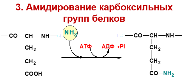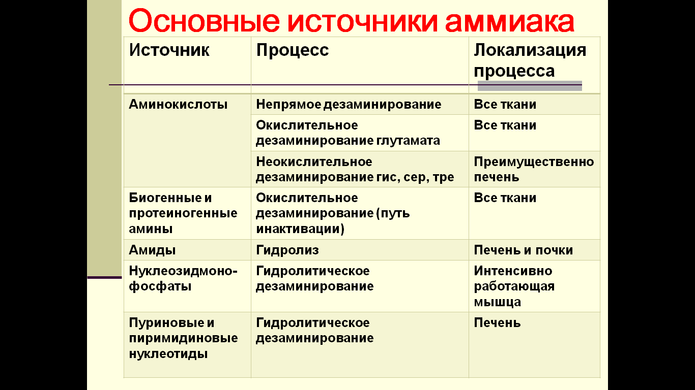 В почках глутамин под влиянием глутаминазы расщепляется с образованием аммиака, идущего на нейтрализацию кислых соединений с образованием аммонийных солей. Этот процесс является одним из механизмов регуляции кислотно-щелочного равновесия в организме и сохранения важнейших катионов (Na+, K+) для поддержания осмотического давления. Глутамин – основной донор азота в организме. Амидный азот глутамина используется для синтеза пуриновых и пиримидиновых нуклеотидов, аспарагина, аминосахаров, белков, глюкозы. Также источниками образования аммиака служат процессы: