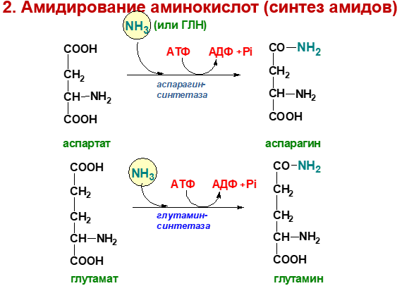 Аммиак в организме образуется в результате дезаминирования аминокислот, биогенных аминов и нуклеотидов. Часть аммиака образуется в кишечнике в результате действия бактерий на пищевые белки (гниение). Концентрация аммиака в крови в норме – 0,4-0,7мг/л. Это токсичное соединение, поэтому аммиак не накапливается, а вступает в реакцию с глутаминовой или аспарагиновой кислотами с образованием индифферентной транспортной формы – глутамина или аспарагина.