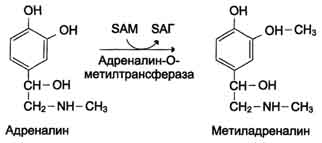 В мозговом веществе надпочечников фенилэтаноламин-N-метилтрансфераза катализирует метилирование норадреналина, в результате чего образуется адреналин. Источником метальной группы служит SАМ.
