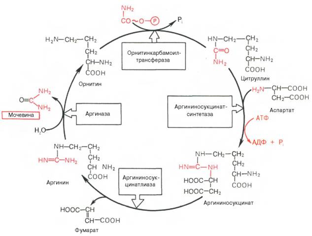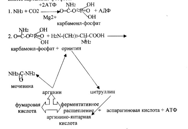 Первые две реакции происходят в митохондриях гепатоцитов. Затем цитруллин транспортируется в цитозоль, где и осуществляются дальнейшие превращения.