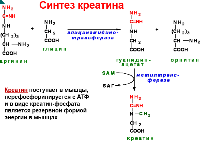 Эта реакция является одним из путей ресинтеза АТФ и протекает в работающей мышце. Креатинин удаляется в составе мочи. Содержание креатинина в моче зависит от развития мышечной массы. Т.о. следует подчеркнуть, что мочевина, креатинин, соли аммония являются конечными продуктами обмена аминокислот, а определение их в моче является диагностическим показателем. В норме мочевины за сутки у взрослого выделяется около 25- 30г, креатинина – 1,5-2,4 г., солей аммония – 0,5-1,2 г.