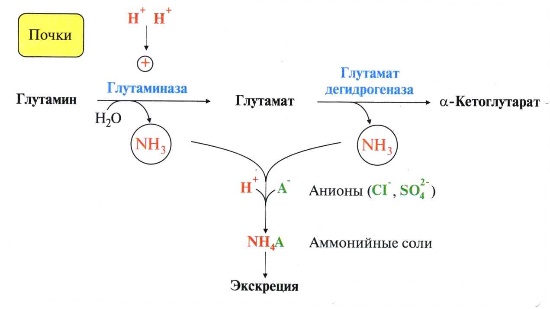 Часть глутамина крови, не задержавшаяся в печени, достигает почек. В эпителиальных клетках почечных канальцев, в основном в дистальных канальцах, имеется фермент глутаминаза, гидролизующая амидную группу с образованием глутамата. Глутамат дезаминируется глутаматдегидрогеназой.