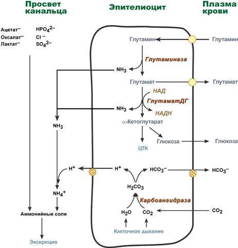 Выделяемый аммиак диффундирует в просвет канальца, где соединяется с ионом Н+, образуя ионы аммонияNH4+. Они связываются с неорганическими (фосфаты, хлориды, сульфаты) или с органическими анионами (уксусной, щавелевой, молочной кислот).