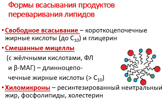 Продукты гидролиза липидов - жирные кислоты с длинным углеводородным радикалом, 2-моноацилглицеролы, холестерол, а также соли жёлчных кислот образуют в просвете кишечника структуры, называемые смешанными мицеллами. Смешанные мицеллы построены таким образом, что гидрофобные части молекул обращены внутрь мицеллы, а гидрофильные - наружу, поэтому мицеллы хорошо растворяются в водной фазе содержимого тонкой кишки. Стабильность мицелл обеспечивается в основном солями жёлчных кислот. Мицеллы сближаются со щёточной каймой клеток слизистой оболочки тонкого кишечника, и липидные компоненты мицелл диффундируют через мембраны внутрь клеток. Вместе с продуктами гидролиза липидов всасываются жирорастворимые витамины A, D, Е, К и соли жёлчных кислот. Наиболее активно соли жёлчных кислот всасываются в подвздошной кишке. Жёлчные кислоты далее попадают через воротную вену в печень, из печени вновь секретируются в жёлчный пузырь и далее опять участвуют в эмульгировании жиров. Этот путь жёлчных кислот называют "энтерогепатическая циркуляция". Каждая молекула жёлчных кислот за сутки проходит 5- 8 циклов, и около 5% жёлчных кислот выделяется с фекалиями.