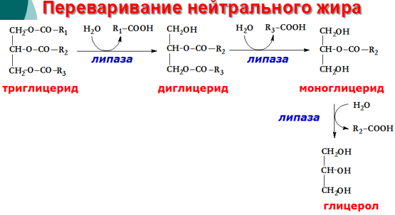 Панкреатическая липаза гидролизует жиры преимущественно в положениях 1 и 3 поэтому основными продуктами гидролиза являются свободные жирные кислоты и 2-моноацилглицеролы (β-моноацилглицеролы). Молекулы 2-моноацилглицеролов также обладают детергентными свойствами и способствуют эмульгированию жира.