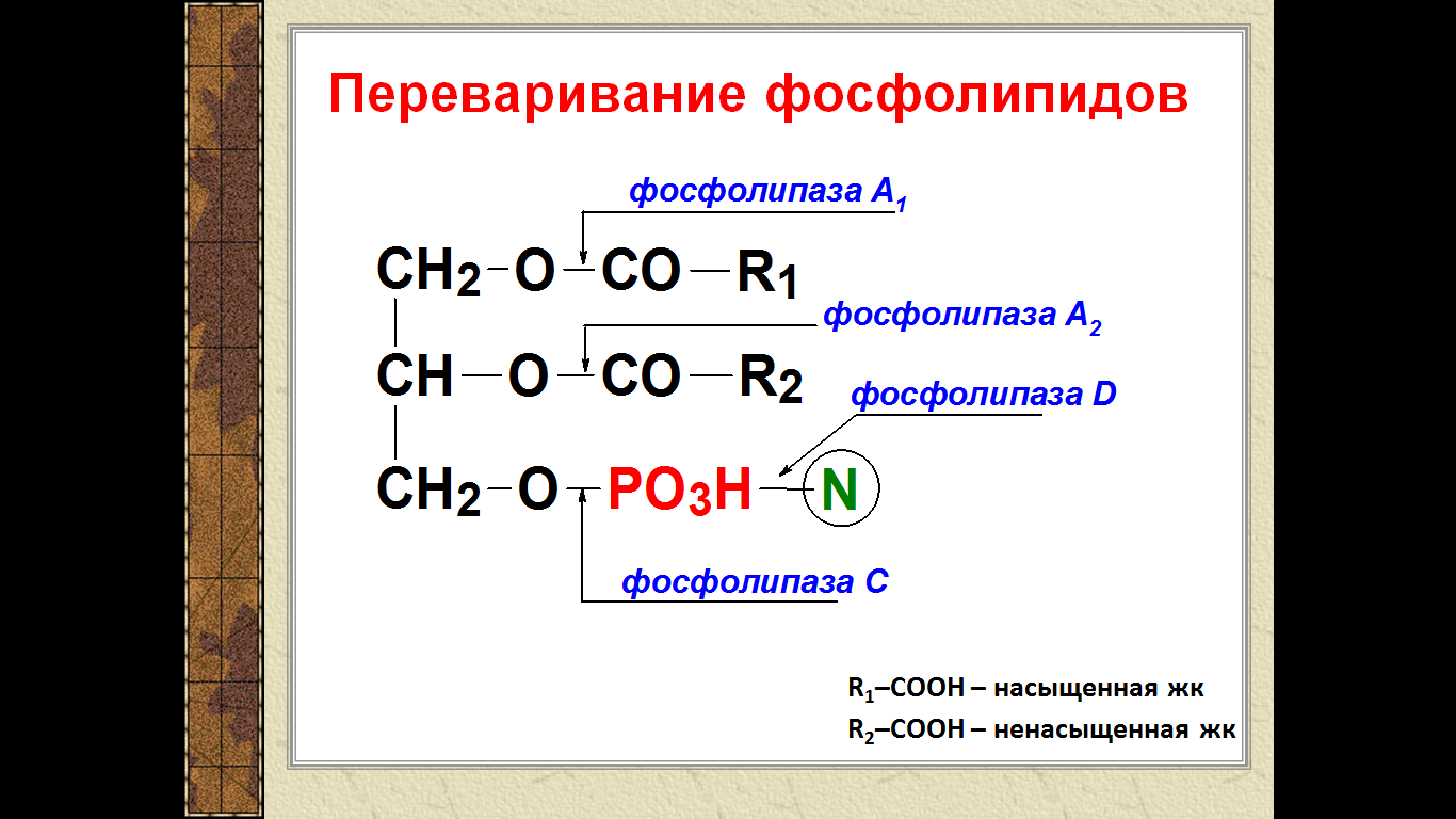 В процессе переваривания и всасывания принимают участие соли желчных кислот, синтезирующиеся в печени из ХС и при этом конъюгируются с таурином или глицином, образуя парные желчные кислоты, например, таурохолевую, гликохолевую.Подавляющая часть фосфолипидов содержимого тонкой кишки приходится на фосфатидилхолин (лецитин), основная масса которого поступает в кишечник с желчью (11–12 г/сут) и меньшая часть (1–2 г/сут) – с пищей. Существует две точки зрения относительно судьбы поступивших в тонкую кишку экзогенных и эндогенных фосфолипидов. Согласно одной из них, и те, и другие фосфолипиды подвергаются в кишечнике атаке со стороны фосфолипазы А2, катализирующей гидролиз сложноэфирной связи в β-положении. В результате катализируемой фосфолипазой А2 реакции глицерофосфолипиды расщепляются с образованием лизофосфолипида и жирной кислоты.