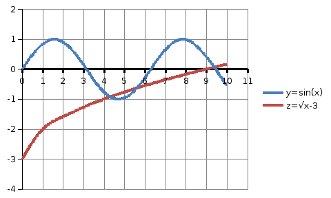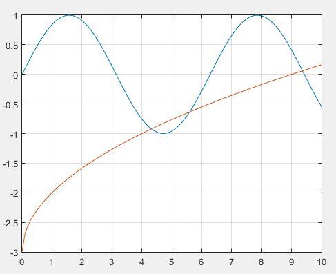 Нет x=0:0.1:10; plot(x,sin(x),x,sqrt(x)-3); legend