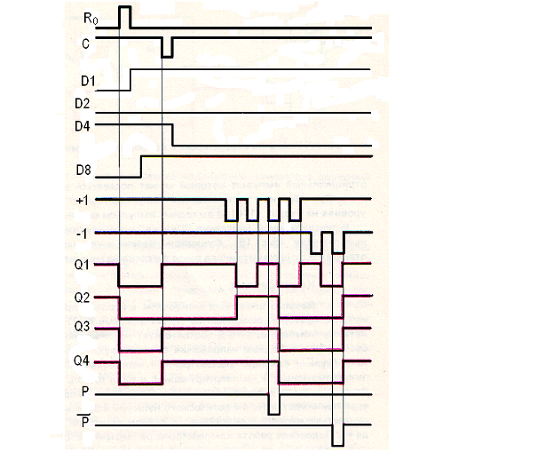 Рис.8 Временная диаграмма работы двоичного реверсивного счётчика.