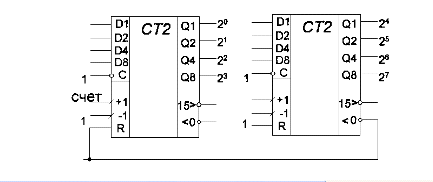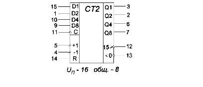 Четырёхразрядный двоичный реверсивный счетчик выполнен на микросхеме КI55ИЕ7. Он работает в коде 1-2-3-4 с коэффициентом деления 16.. Вход R служит для установки счетчика в исходное (нулевое) состояние. На вход С при этом должно быть подано напряжение высокого уровня. Установка счетчика в состояние логического нуля производится при подаче положительного сигнала на вход R. В остальное время работы на входе R должно быть напряжение низкого уровня. Предварительная запись в счетчик любого числа от 0 до 15 по входам D1,D2, D3, D4’(D8 - старший разряд) возможна при подаче на вход С отрицательного импульса. Прямой счёт происходит при подаче отрицательных импульсов на вход +1. На входах -1 и С при этом должны быть единичные сигналы. Триггеры счётчика переключаются по срезам входных импульсов. Одновременно с каждым 16-м импульсом на выходе >15 формируется отрицательный импульс, который может подаваться на вход +1 следующего счётчика. При обратном счете входные импульсы подают на вход -1 (при единичных уровнях на входах +1, С), а выходные импульсы снимают с выхода< 0.