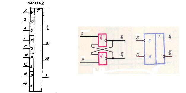 Рис.10 Схема RS триггера на логических элементах и расположение выводов микросхемы.