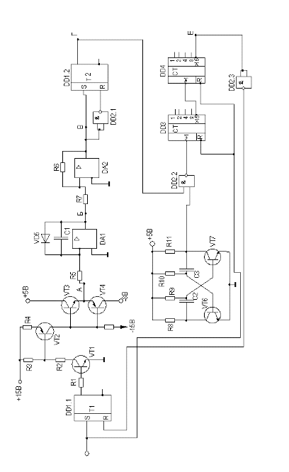 В ходе подбора элементов схемы необходимо было выполнить согласование выхода компаратора на микросхеме DA2 с уровнем ТТЛ логики.. Для этого была использована микросхема КР140УД8, имеющую согласованный с ТТЛ логикой выход. Мультивибратор рассчитан на напряжение 5 вольт для выработки импульсов соответствующих уровню логической единицы ТТЛ логики. Вход переполнения счетчика включён через инвертор поскольку RS триггер Т1 по входу R обнуляется единицей. Сопротивление на входе транзистора VT1 рассчитано так, чтобы при уровне логической единицы +5Внаходился в состоянии насыщения, а при уровне +0,2В в состоянии отсечки. При этом вся схема управляется коротким импульсом уровня порядка +5В.