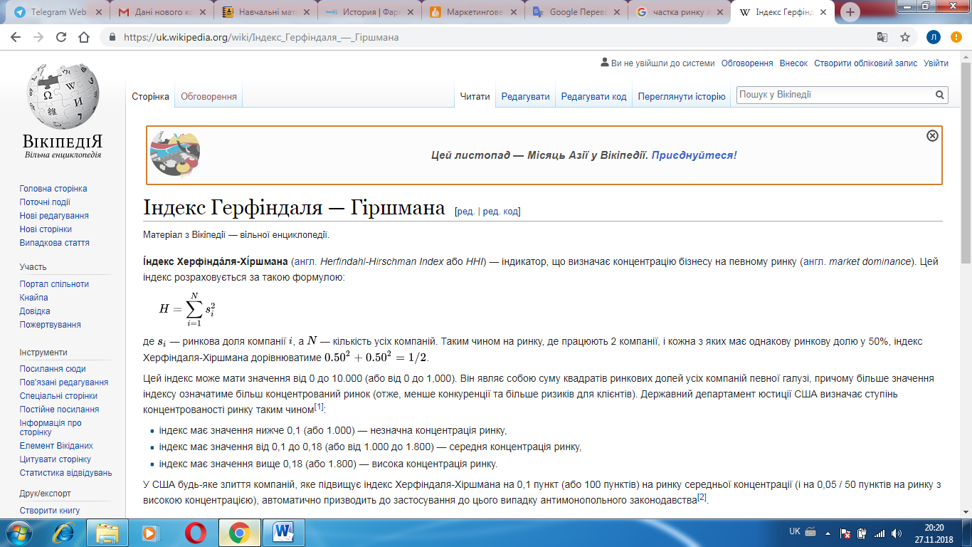 Для отримання більш повної характеристики ринку потрібно провести аналіз конкурентоспроможності ринку. Тому визначаємо за допомогою індексаХерфінделя-Хіршмана концентрацію бізнесу.