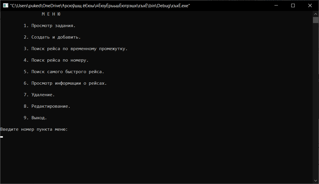 Пользователь вводит номер пункта меню и вызывается соответствующая функция. Программа заканчивает работу, когда выбран пункт меню 9 – «Выход».
