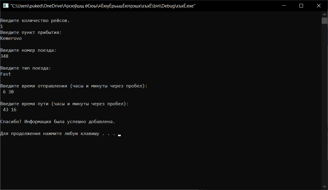 Рисунок 4 – Добавление новых записей о рейсах, соответствует 2 пункту меню