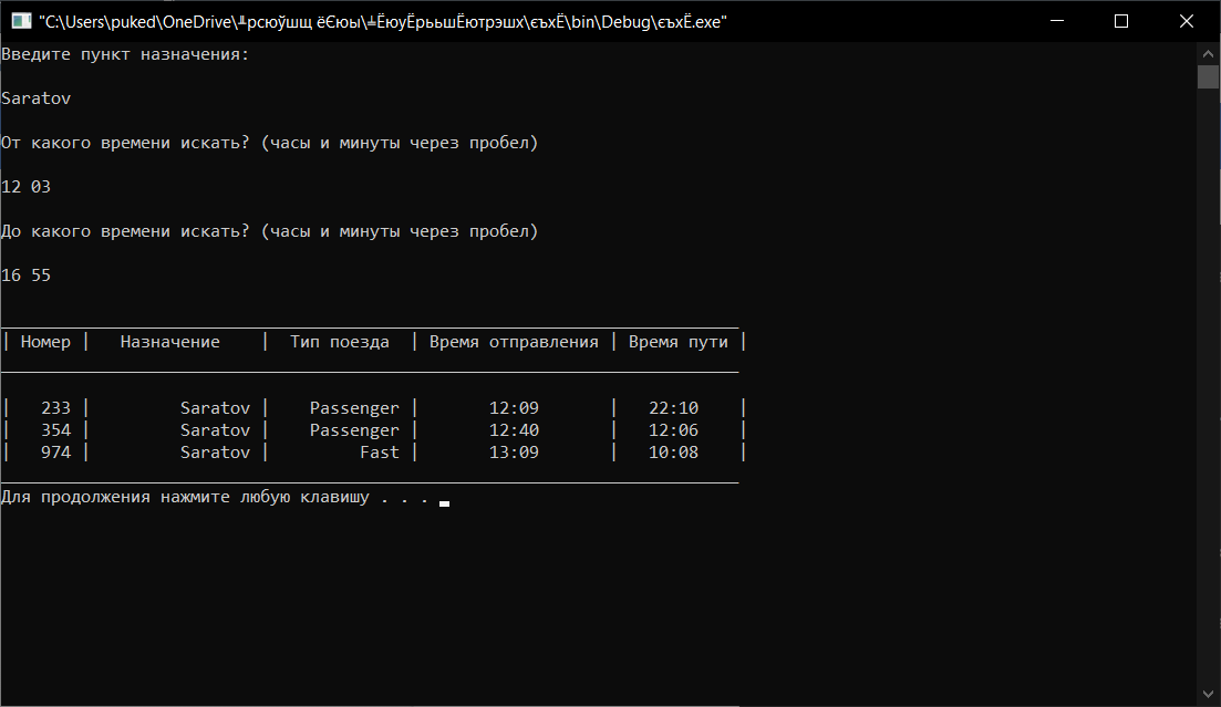Рисунок 5 – Поиск рейса в определенный временной промежуток, соответствует 3 пункту меню