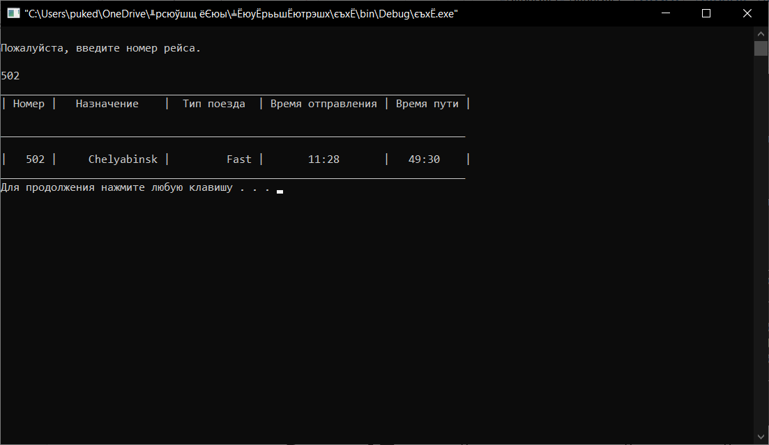 Если пользователь знает номер рейса, он может просмотреть информацию о нем выбрав 4 пункт; работа функции представлена на рисунке 6.