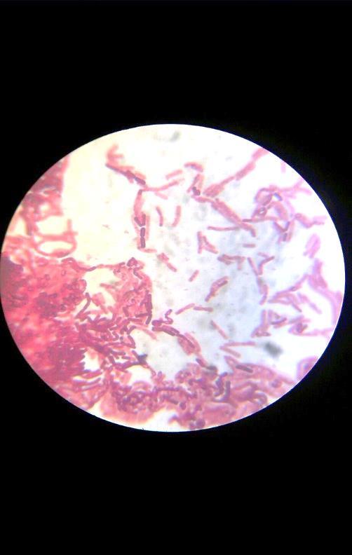 Рис. 1 Увеличение: 1600 Форма клеток: слабо-изогнутые палочки Характер расположения: цепочечный Способность к спорообразованию: спорообразующие |