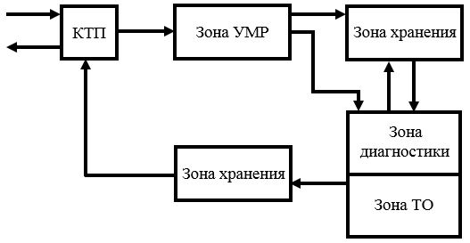После прохождения зоны ЕО автомобиль поступает в зону Д, где проводится диагностирование либо отдельных узлов и агрегатов, либо технического состояния автомобиля в целом, после чего автомобиль направляется в зону ТО-1 либо в зону ожидания если пост ТО-1 занят, после освобождения поста ТО-1 на него поступает автомобиль. Далее автомобиль передается в зону хранения, откуда передается заказчику через КТП. Схема движения автомобиля в зоне УМР представлена на рисунке 1.1
